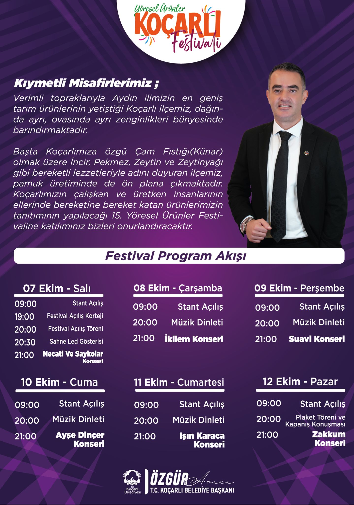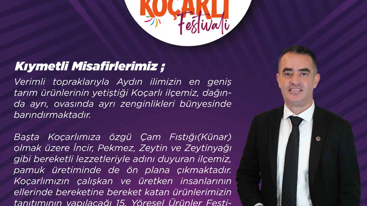 Koçarlı Belediye Başkanı Özgür Arıcı yaptığı açıklamada “ İlçemiz yöresel ürünler açısından çok önemli bir yere sahip, Çam Fıstığı, pamuk, zeytin, zeytin yağı, incir ve birçok ürünümüzü ziyaretçilerimize tanıtmak için heyecanlıyız. Yöresel zenginliğimizi eğlence ve müzikle birleştirerek misafirlerimize unutulmaz bir 6 gün yaşatmak istiyoruz. Tüm halkımızı bekliyoruz” dedi.