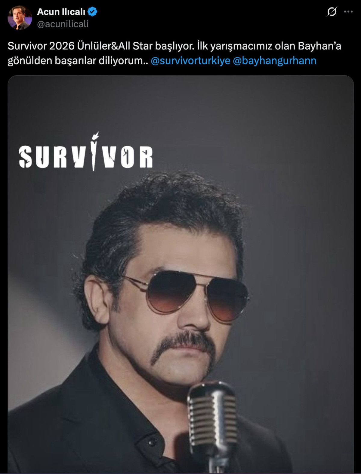 Acun Ilıcalı paylaşımında, "Survivor 2026 Ünlüler&All Star başlıyor. İlk yarışmacımız olan Bayhan’a gönülden başarılar diliyorum." ifadelerini kullandı.