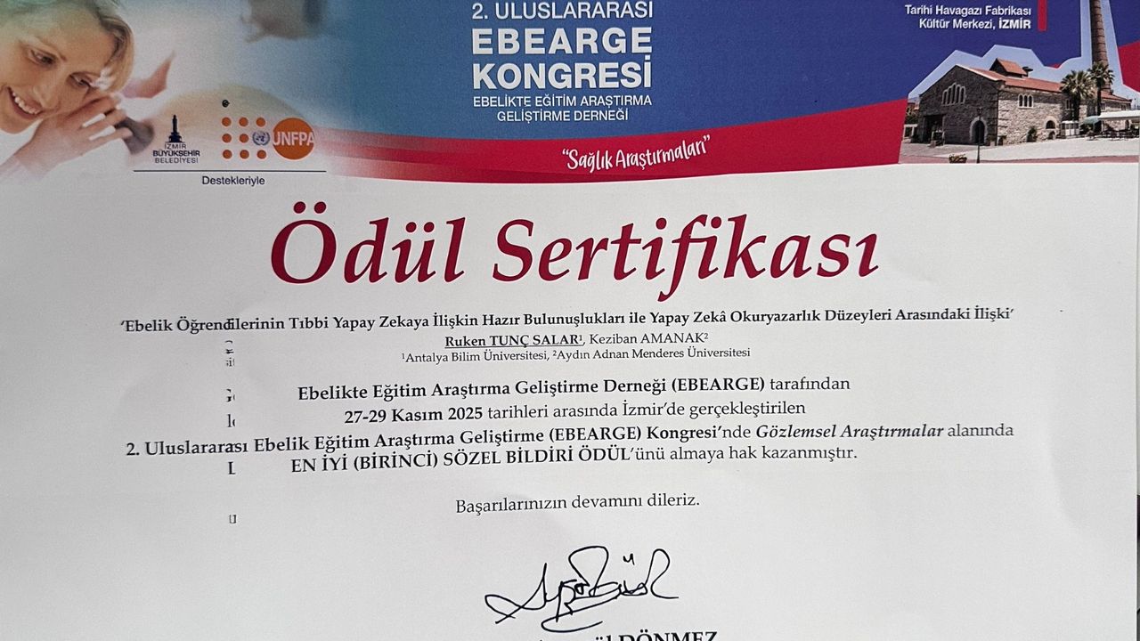 Kongrede sunulan çalışma, Gözlemsel Araştırmalar alanında En İyi Sözlü Bildiri Birincilik Ödülüne layık görüldü. Çalışmayı hazırlayan Keziban Amanak ile doktora öğrencisi Ruken Tunç Salar, elde edilen başarı dolayısıyla tebrik edildi.