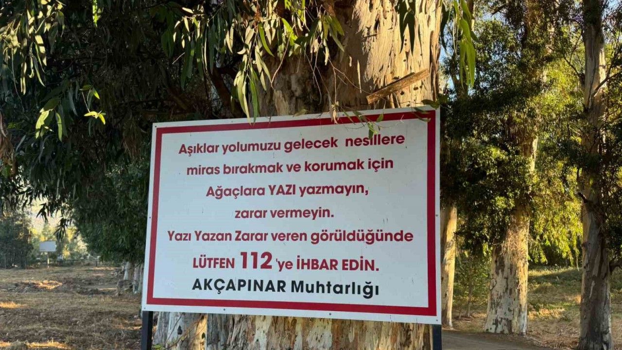 Tabelada, "Aşıklar yolumuzu gelecek nesillere miras bırakmak ve korumak için ağaçlara yazı yazmayın, zarar vermeyin. Yazı yazan veya zarar veren görüldüğünde lütfen 112’ye ihbar edin" ifadeleri yer aldı.