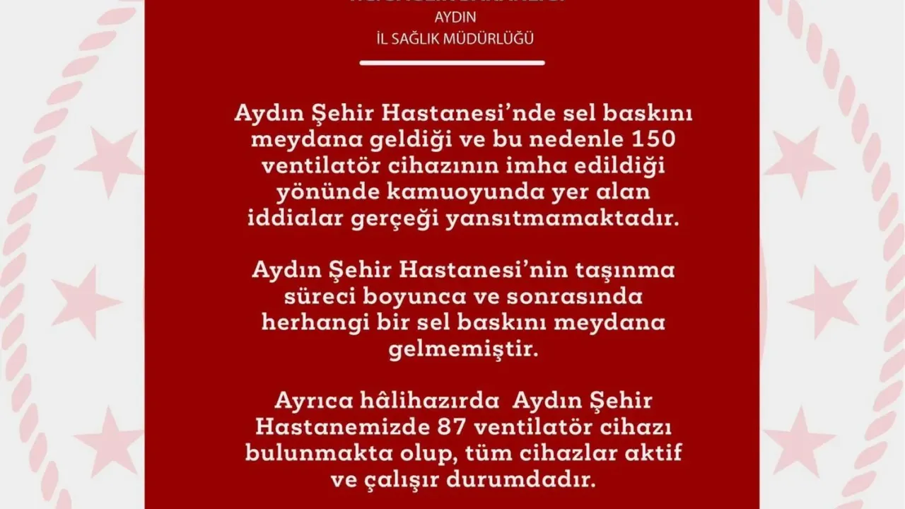 Yapılan açıklamada, “Aydın Şehir Hastanesi’nde sel baskını meydana geldiği ve bu nedenle 150 vantilatör cihazının imha edildiği yönünde kamuoyunda yer alan iddialar gerçeği yansıtmamaktadır. Hastanenin taşınma süreci boyunca ve sonrasında herhangi bir sel baskını meydana gelmemiştir” denildi.