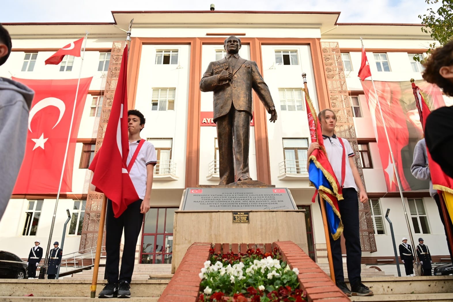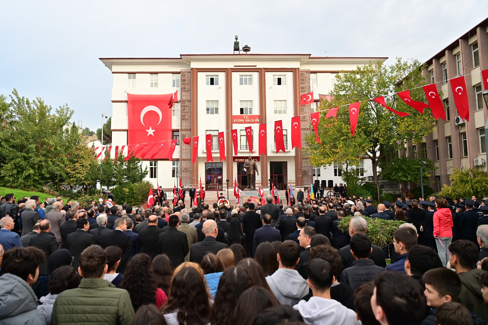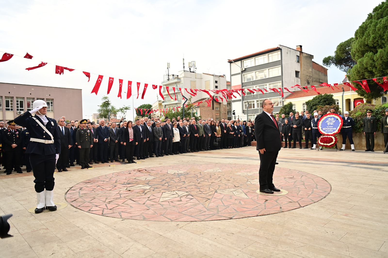 Aydın Valiliği, Büyükşehir Belediyesi ve Garnizon Komutanlığı çelenklerinin Atatürk Anıtı’na sunulmasıyla başlayan program, Gazi Mustafa Kemal Atatürk’ün kendi sesinden 10. Yıl Nutku’nun dinletisiyle devam etti. Ardından saygı duruşunda bulunuldu ve İstiklal Marşı okundu. Programda anma mesajları da paylaşıldı.