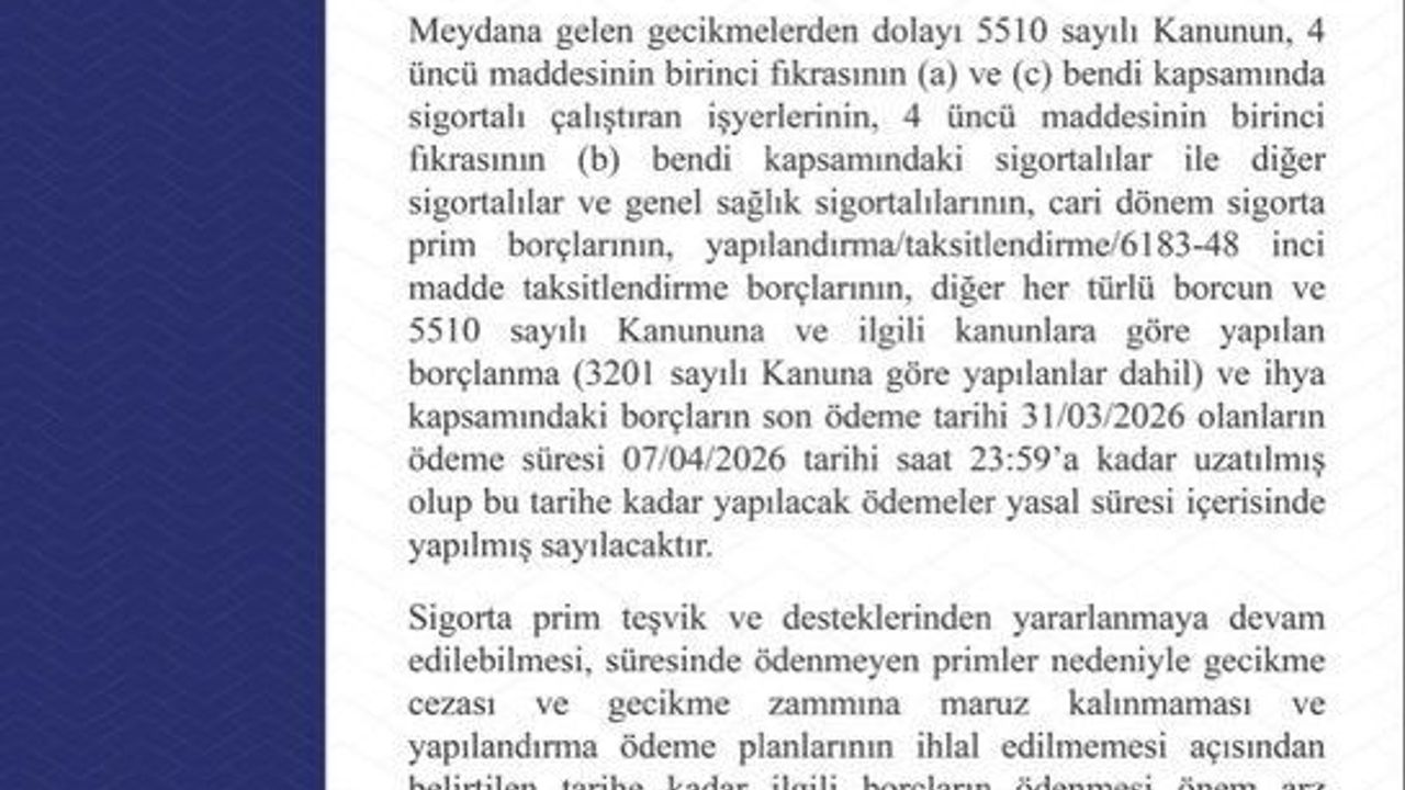 Karar, Aydın’daki sigortalı çalıştıran işyerleri, 4/b kapsamındaki esnaflar ve genel sağlık sigortalılarını doğrudan etkiliyor. Cari dönem sigorta primleri, yapılandırma ve taksitlendirme ödemeleri ile borçlanma kapsamındaki tüm borçların son ödeme tarihi 7 Nisan 2026 saat 23.59’a kadar uzatıldı. Bu tarihe kadar yapılan tüm ödemeler yasal süresi içinde yapılmış sayılacak.