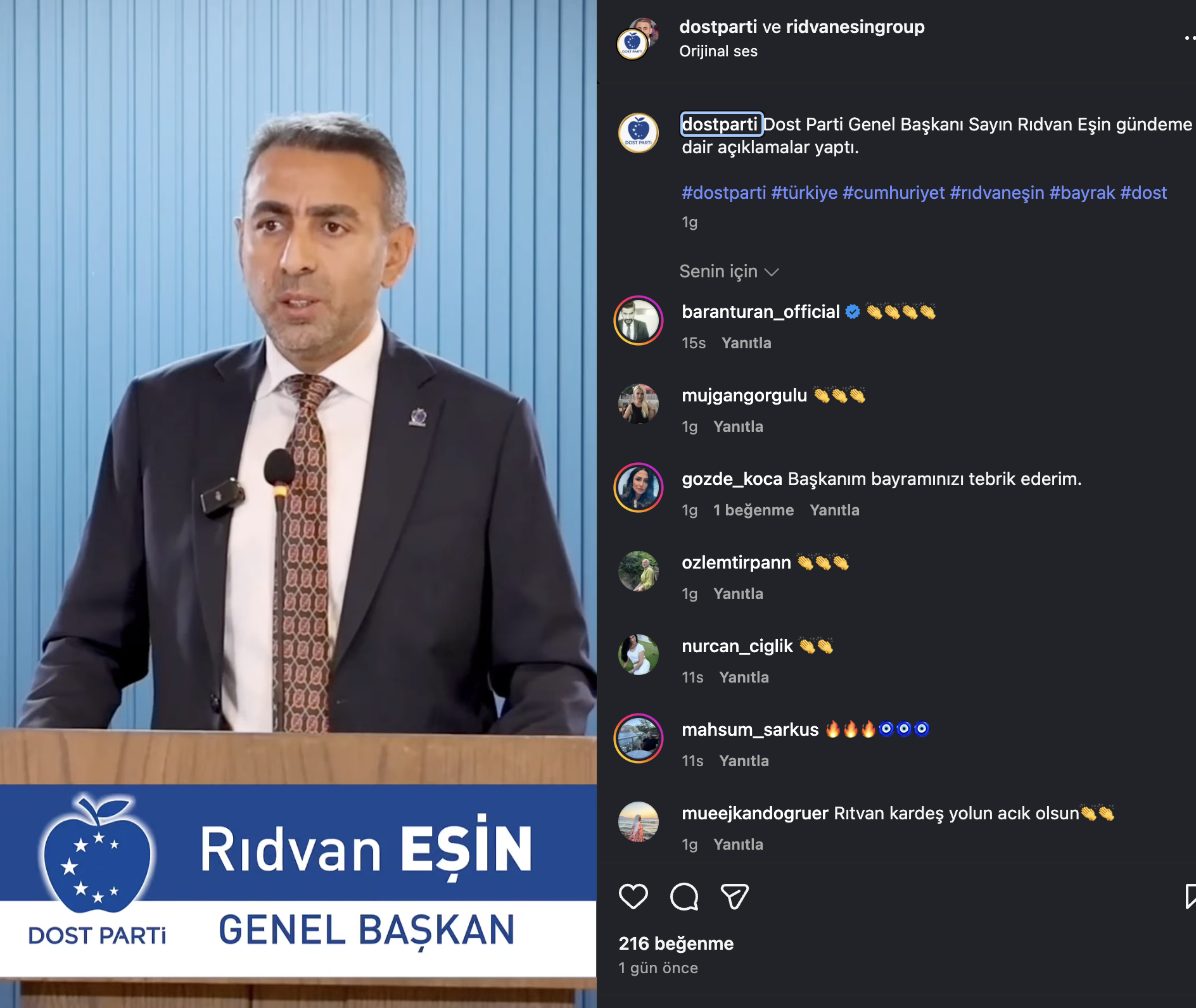 Dost Parti’nin kurucu genel başkanlığını Aydınlı iş insanı Rıdvan Eşin yapacak. Eşin, geçmiş yıllarda çeşitli siyasi partilerde aday ve aday adayı olarak aktif görevler üstlenmişti.