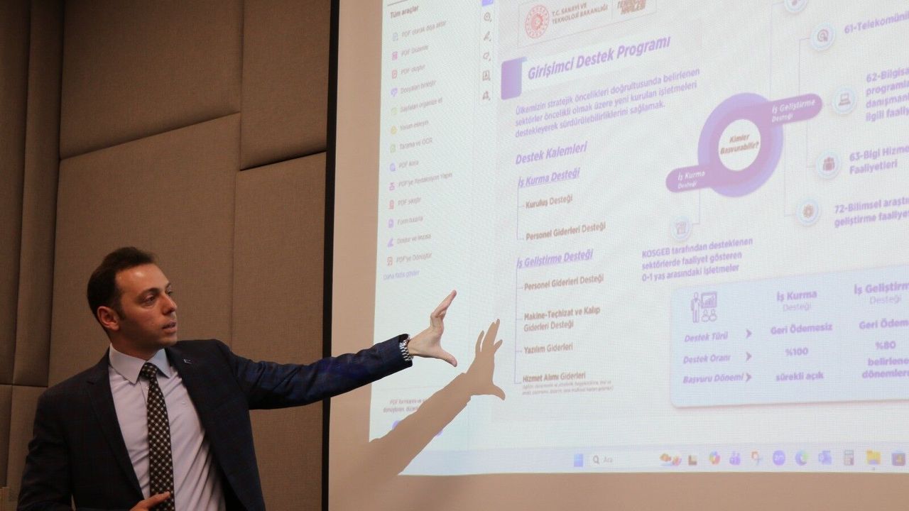 AYTO Akademi Eğitim Salonu'nda düzenlenen toplantıda, Küçük ve Orta Ölçekli İşletmeleri Geliştirme ve Destekleme İdaresi Başkanlığı Aydın İl Müdürü Berkay Çetin Oral tarafından başta İmalat Sanayi İçin Kredi Finansmanı ve İstihdamı Koruma Programı olmak üzere devletin sunduğu destekler hakkında kapsamlı bilgiler verildi.