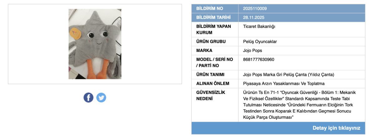 İncelemelerde, Jojo Pops marka gri pelüş çantanın boğulma tehlikesi oluşturduğu belirlendi.