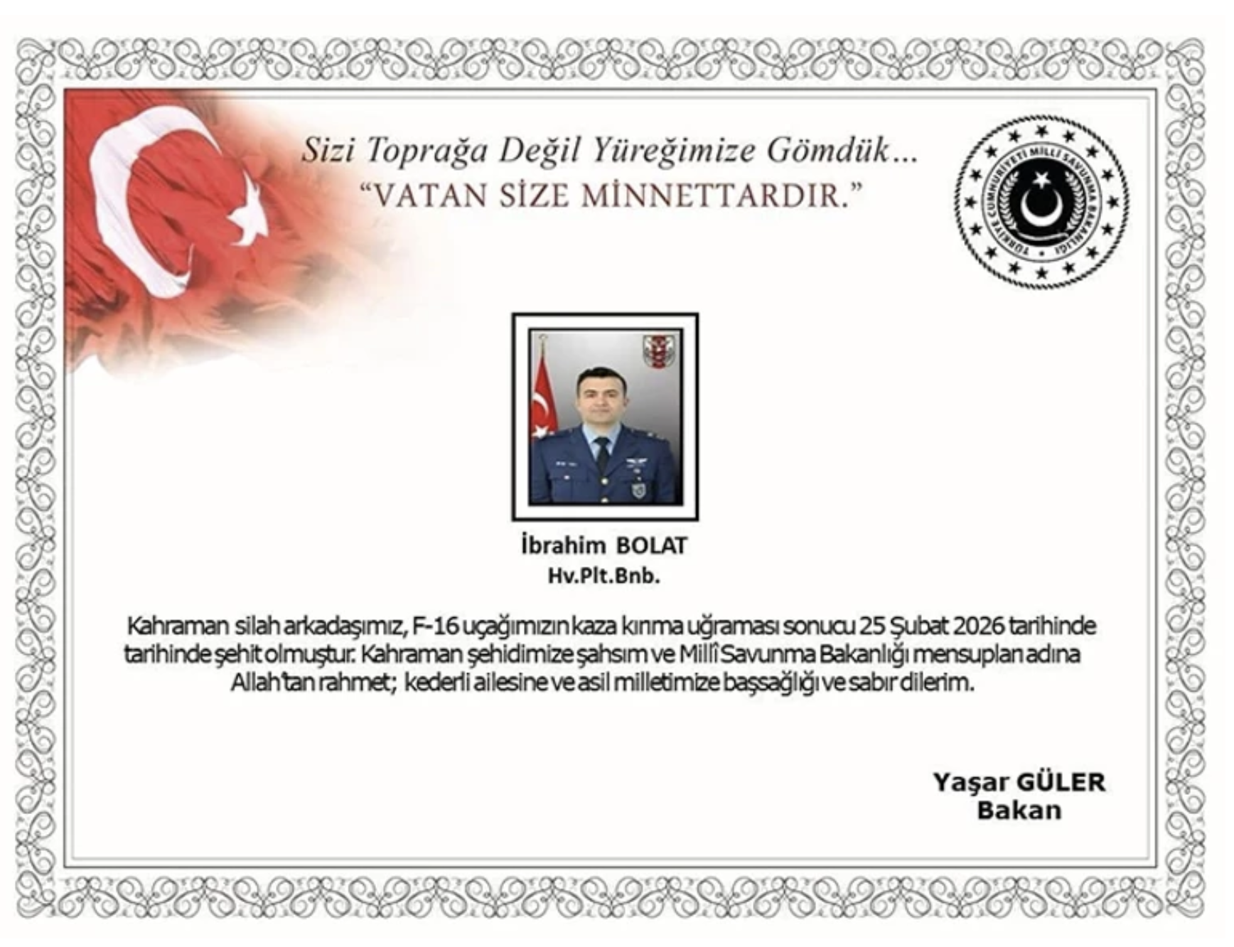 MSB açıklamasında, “Pilotumuz şehit olmuştur. Kazanın nedeni, kaza kırım ekibinin yapacağı incelemeler sonucunda belirlenecektir. Şehit olan pilotumuza Allah’tan rahmet, ailesine, Türk Silahlı Kuvvetlerimize ve asil milletimize başsağlığı dileriz” denildi.