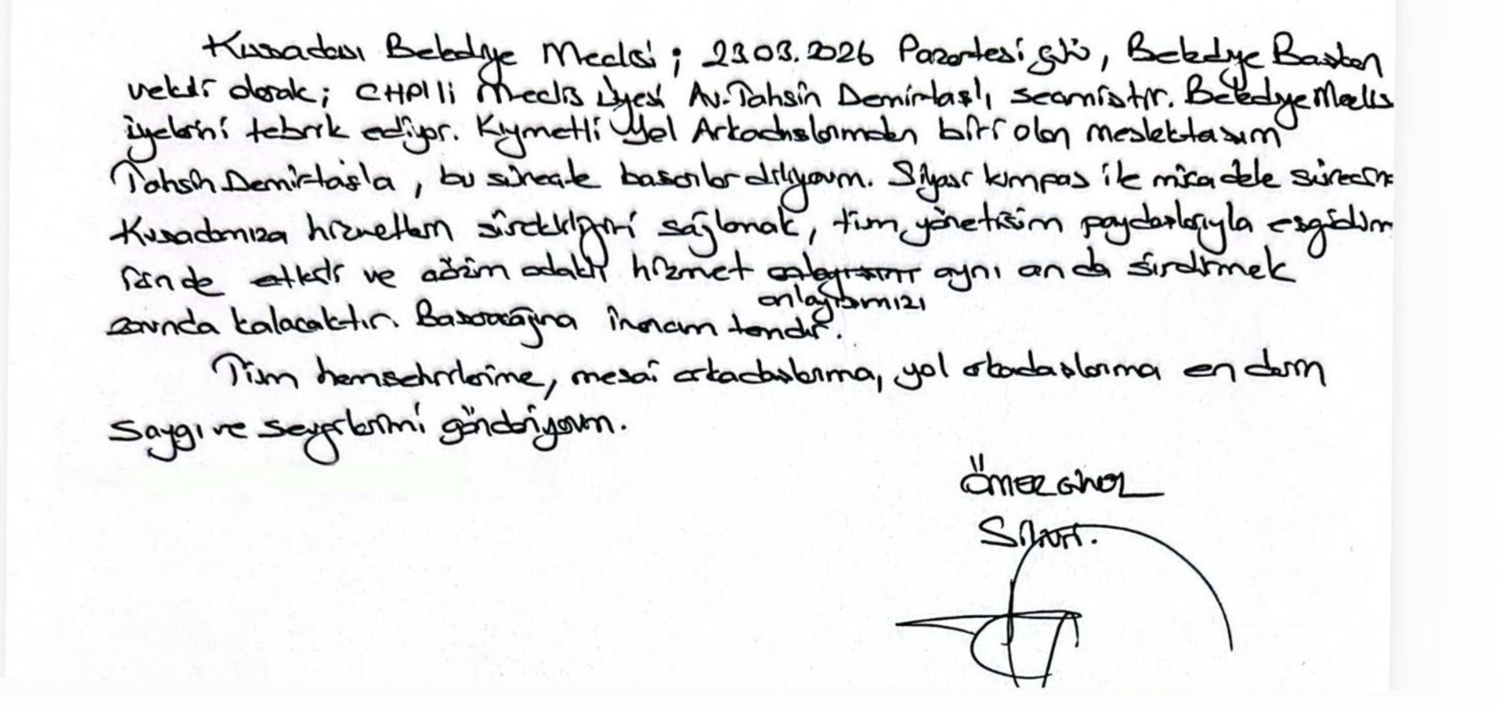 “Kuşadası Belediye Meclisi 23.03.2026 Pazartesi günü Belediye Başkan vekili olarak CHP’li Meclis Üyesi Av. Tahsin Demirtaş’ı seçmiştir. Belediye Meclis üyelerini tebrik ediyor, kıymetli yol arkadaşlarımdan biri olan meslektaşım Tahsin Demirtaş’a bu süreçte başarılar diliyorum.