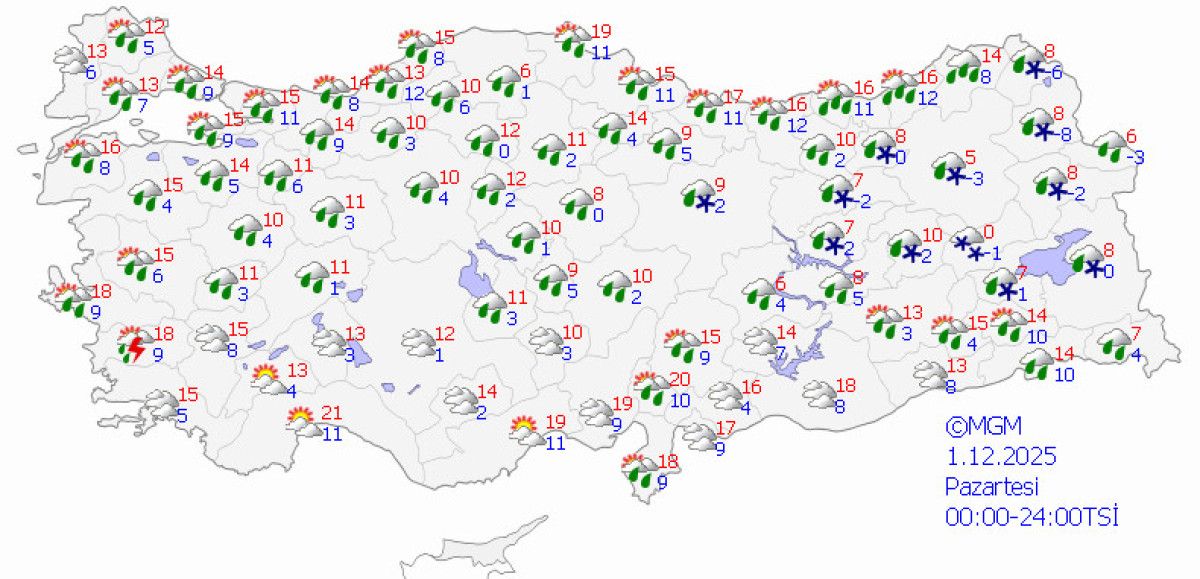 Haftanın ilk günü ülke genelinde parçalı ve çok bulutlu bir hava hakim.