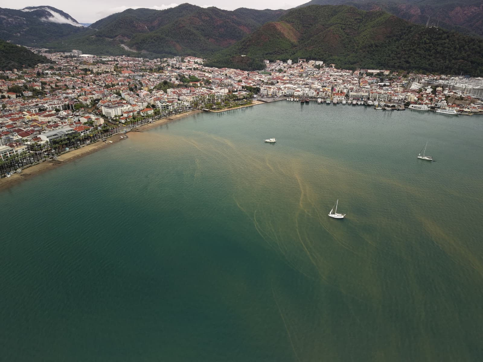 Marmaris'te önceki gece yarısından itibaren etkili olan yağışlar aralıklı olarak devam ederken, ilçede dün şiddetli fırtına sebebiyle dört tekne karaya oturmuş, ağaçlar devrilerek yollara dökülmüştü. Yağışlar, özellikle kırsal mahalleleri etkilerken, yollar ve tarlalarda da yoğun su birikintileri meydana gelmişti. İlçe genelinde bugün sabah saatlerinden itibaren yağış aralıklı olarak etkisini sürdürürken, dereler ve sokaklardaki yağmur suları da denize dökülmeye başladı. Marmaris Kemeraltı Mahallesi Halk Plajı mevkiinde denizle buluşan yağmur suları ise denizi çamur rengine büründürdü. Yağışların ardından çamura rengine bürünen deniz ise drone pilotu Resul Bulguroğlu tarafından havadan görüntülendi. Denizde oluşan renk değişimi net bir şekilde görünürken, derelerin denizle birleştiği noktadaki çamur rengi yoğunluğu dikkat çekti.