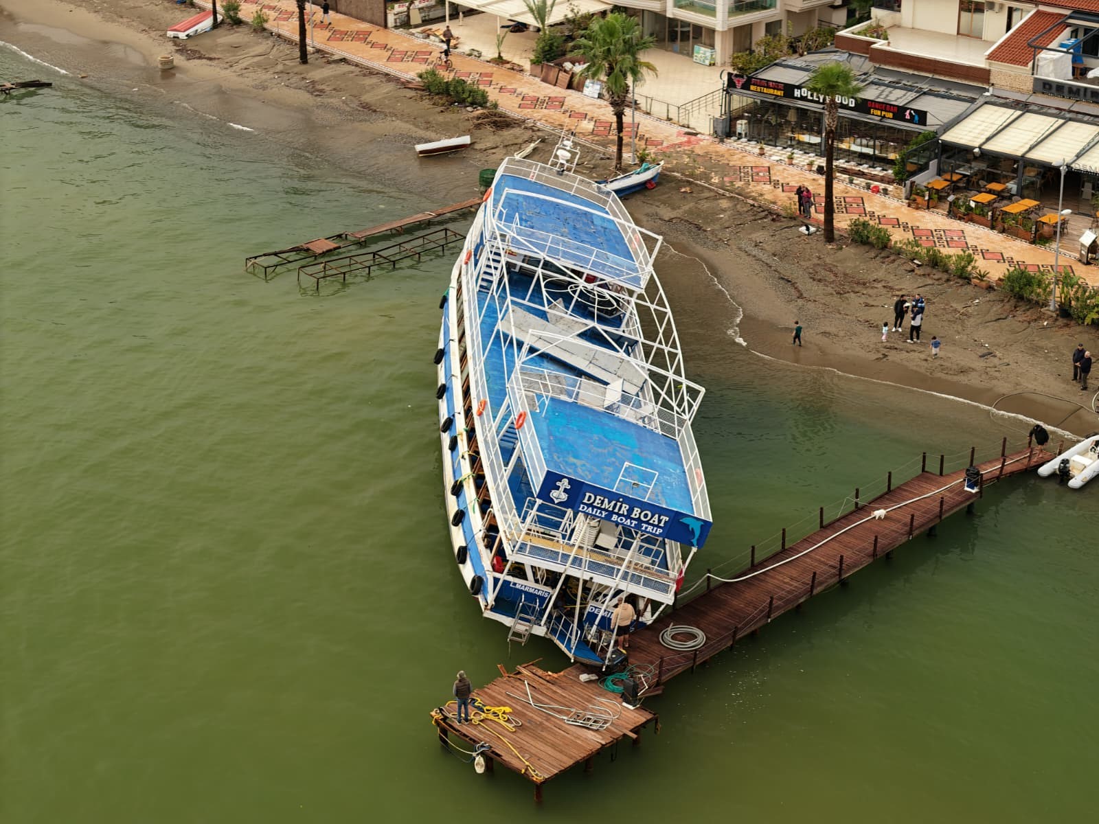 Yağışların yanı sıra etkili olan fırtına sebebiyle de ilçedeki Granitsa, Kastabos, Wiseone ve Demir-1 isimli 4 gezi teknesi de sürüklenerek karaya oturmuştu. Uzunyalı mevkiinde iskeleye çarparak karaya oturan Demir-1 isimli tekne de Bulguroğlu tarafından havadan görüntülendi. Herhangi bir can kaybı veya yaralanmanın yaşanmadığı olayın ardından karaya oturan gezi teknelerinin yapılan incelemelerinde deniz kirliliği oluşturmadığı tespit edilirken, havadan görüntülenen Demir-1 isimli teknenin yan yatmış vaziyette olduğu görüldü. Olay sonrasında gerekli incelemeleri yapılan teknelerin hava şartlarının düzelmesinin ardından kaldırılacağı öğrenildi.