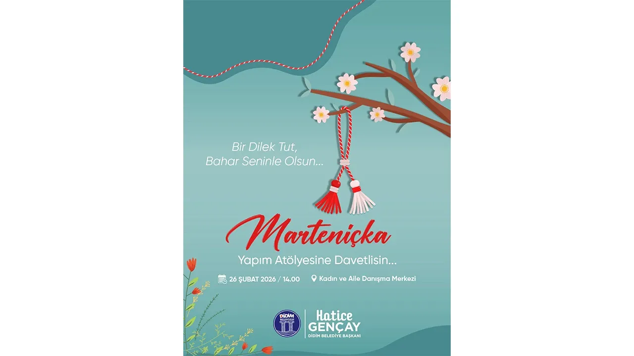 26 Şubat 2026 Perşembe günü saat 14.00’te, Didim Belediyesi Kadın ve Aile Danışma Merkezi’nde gerçekleştirilecek “Marteniçka Yapım Atölyesi” ile kırmızı ve beyaz iplerin umut, sağlık ve bereketi simgelediği bu anlamlı gelenek yeniden hayat bulacak. Etkinlik boyunca Marteniçka’nın kültürel geçmişi ve taşıdığı sembolik anlamlar katılımcılarla paylaşılacak; dayanışma ve birlik duygusu ön planda tutulacak.