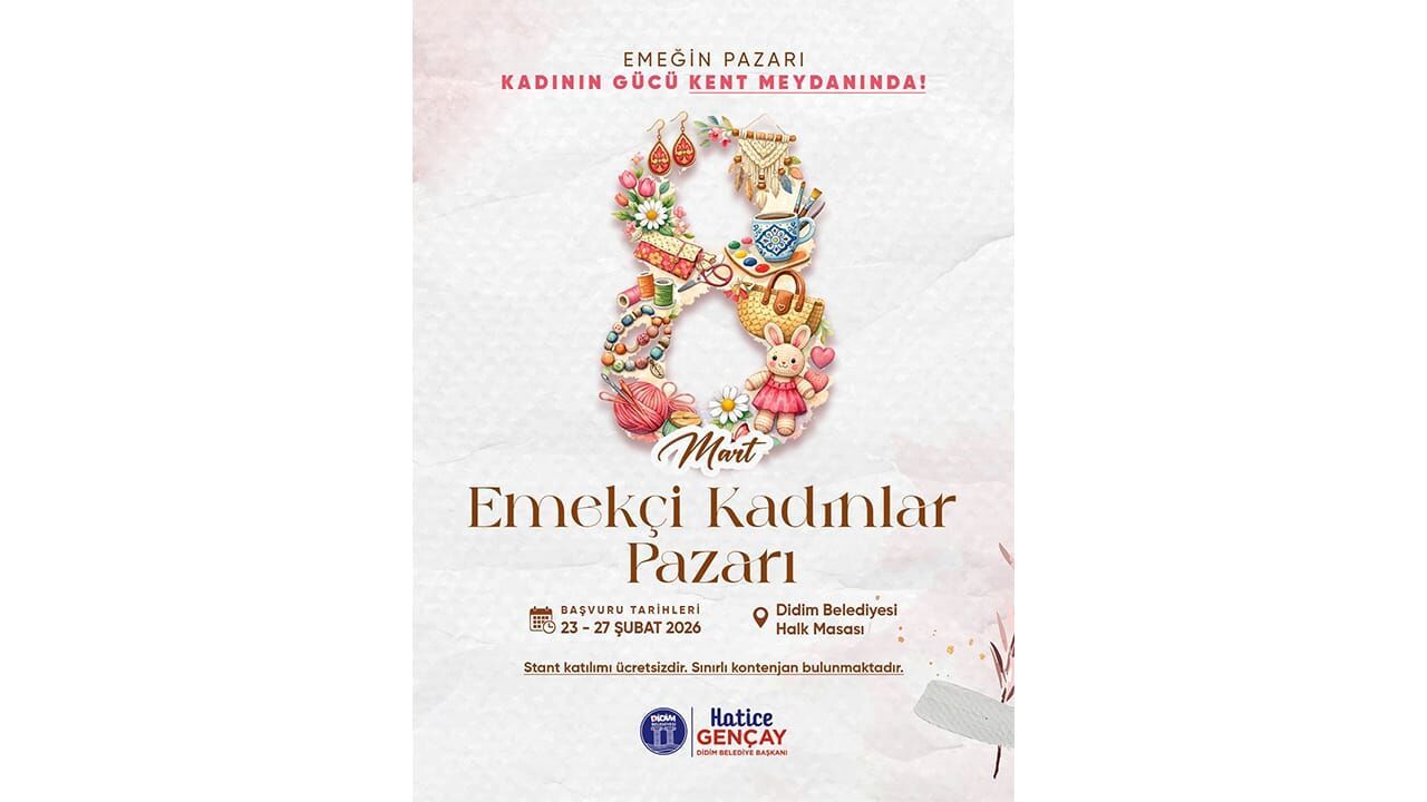 Takıdan tekstile, el sanatlarından dekoratif ürünlere kadar birçok özgün çalışmanın yer alacağı organizasyon; kadınların ekonomik hayata katılımını desteklemeyi, yerel üretimi teşvik etmeyi ve kadın emeğini görünür kılmayı amaçlıyor. 23-27 Şubat tarihleri arasında yapılacak başvurular, Didim Belediyesi Halk Masası'ndan kabul edilecek. Stant katılımının ücretsiz olacağı Emekçi Kadınlar Pazarı'nda kontenjanın sınırlı olduğu belirtildi.