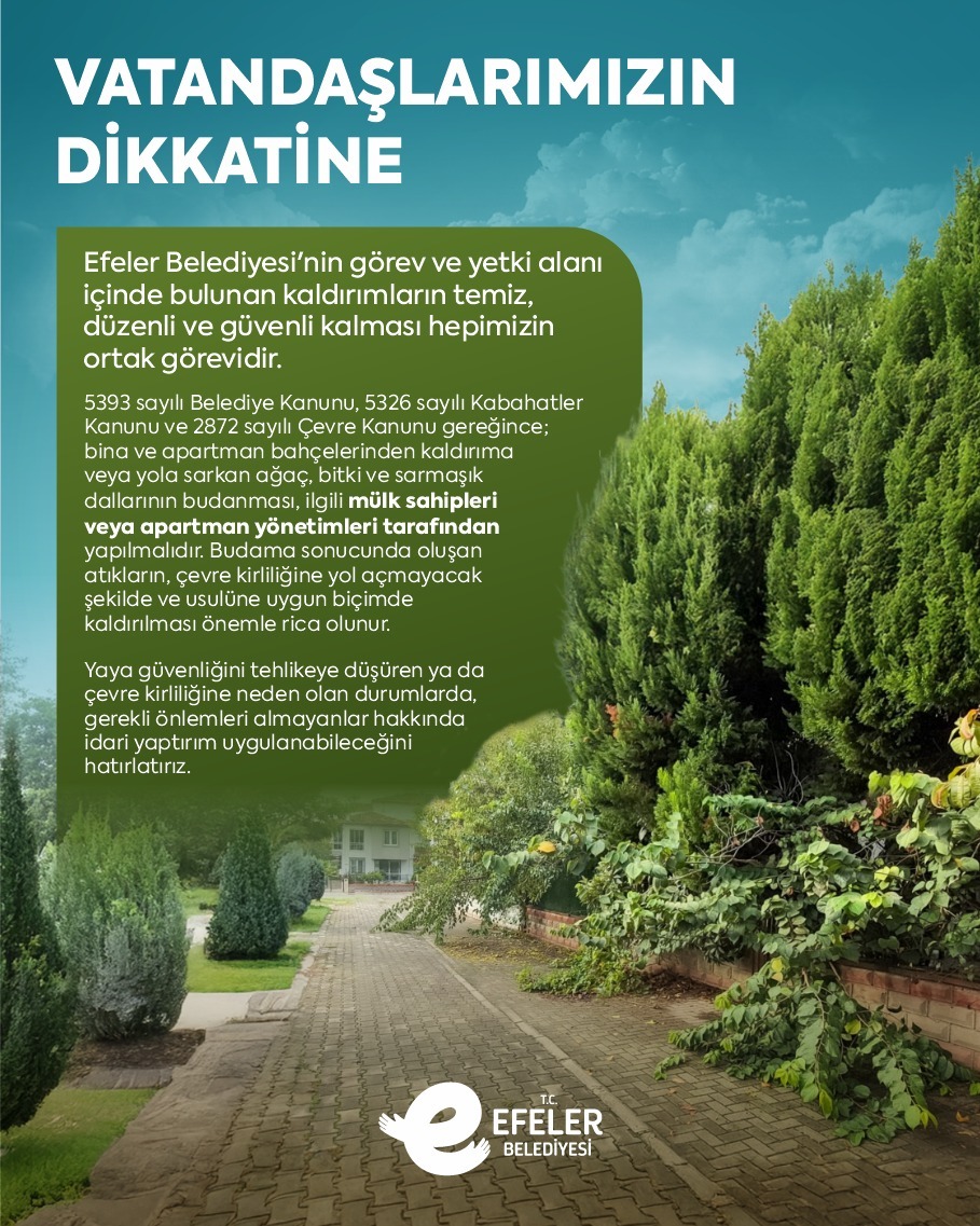 Ayrıca budama sonucu oluşan atıkların çevreye zarar vermeyecek şekilde kaldırılmasının önemine dikkat çekilen açıklamada, yaya güvenliğini tehlikeye düşüren veya çevre kirliliğine yol açan durumlarda idari yaptırım uygulanabileceği hatırlatıldı. Efeler Belediyesi, çevre düzeni ve vatandaş güvenliğini sağlamak için çalışmalarını kent genelinde sürdüreceğini duyurdu.