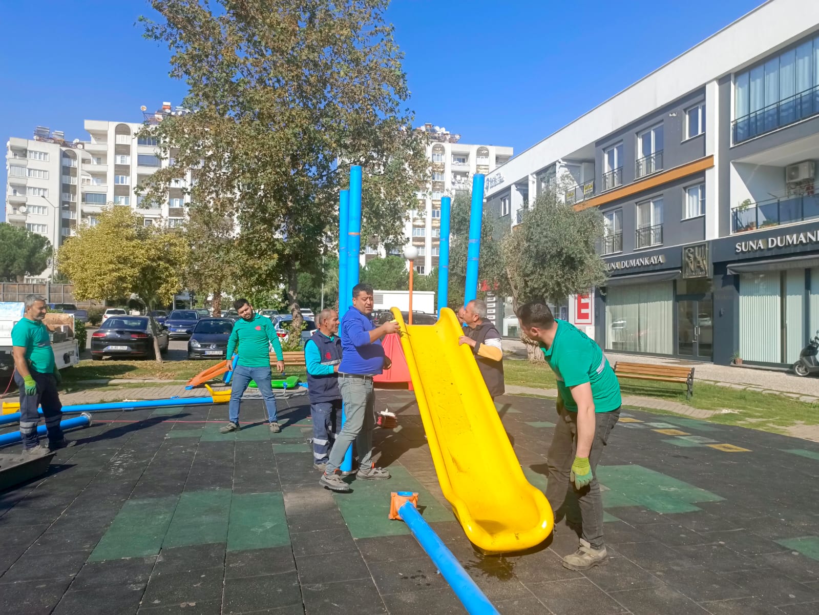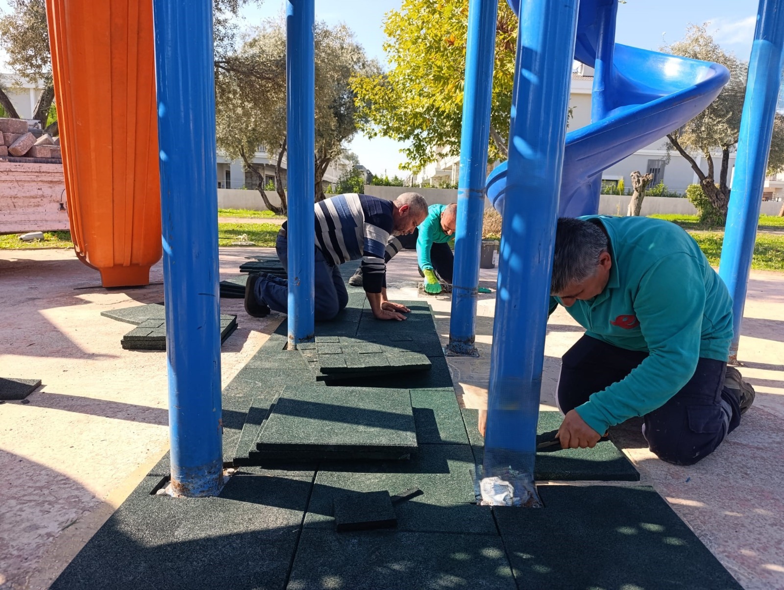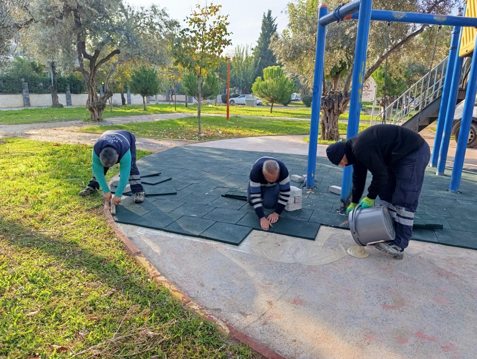 Parklarda bozulan oyun grupları yenileniyor, eskiyen banklar ve çöp kovaları değiştiriliyor, kauçuk zeminler onarılarak çocukların güvenle oyun oynayabileceği hale getiriliyor.