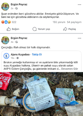 Poyraz, gözaltı sırasında hangi suçlamayla alındığını bilmediğini belirtti ve sosyal medyadan, "Şu an evimden beni gözaltına aldılar. Emniyete götürülüyorum ve beni ne için gözaltına aldıklarını da söylemiyorlar." açıklamasını yaptı.