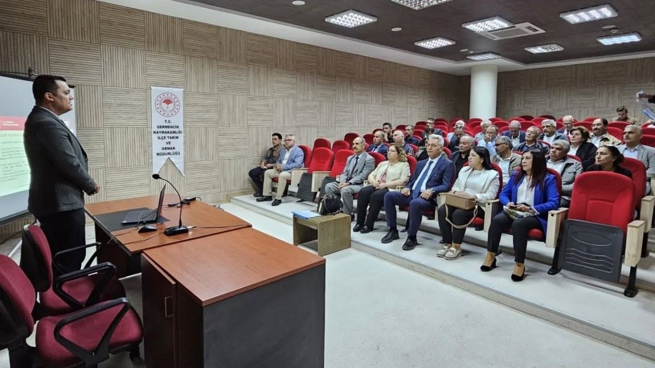 Aydın İl Tarım ve Orman Müdürlüğü tarafından yürütülen Tarım Sayımı çalışmaları kapsamında, resen kayıtlı arazilerin tespitine yönelik yapılacak uygulamalar hakkında Germencik mahalle muhtarlarına bilgilendirme toplantısı düzenlendi. Toplantı öncesinde İl Koordinatörleri Ertan Özdemir ve Murat Şahin ile Koordinasyon ve Tarımsal Veriler Şube Müdürü Mustafa Özsemerci, Germencik Kaymakamı Sultan Doğru’yu ziyaret ederek çalışmalar hakkında bilgi verdi. Germencik Kaymakamı Sultan Doğru’nun da katılım sağladığı toplantıda, İlçe Tarım ve Orman Müdürü İlknur Kavas ve konu sorumlusu personel tarafından muhtarlara tarımsal verilerin güncellenmesi, arazi tespit süreçleri ve sahada yürütülecek çalışmalar hakkında detaylı bilgiler aktarıldı.