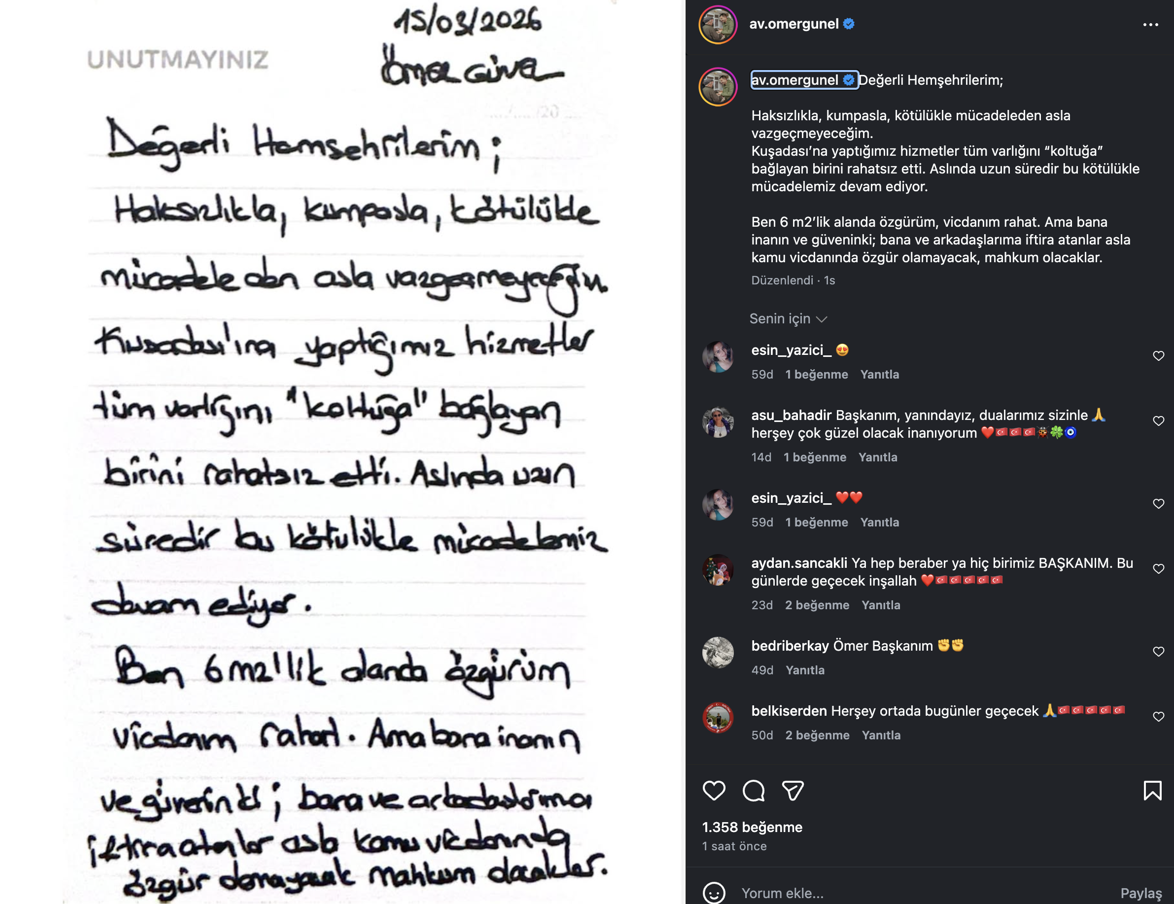 “Ben 6 metrekarelik alanda özgürüm, vicdanım rahat. Ama bana inanın ve güvenin ki; bana ve arkadaşlarıma iftira atanlar asla kamu vicdanında özgür olamayacak, mahkum olacaklar.”