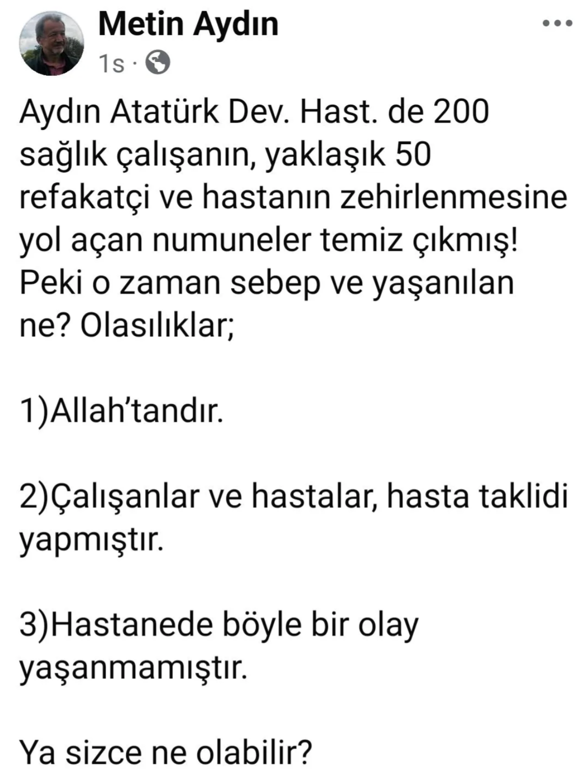“Aydın Atatürk Devlet Hastanesi’nde 200 sağlık çalışanı, yaklaşık 50 refakatçi ve hastanın zehirlenmesine yol açan numuneler temiz çıkmış! Peki o zaman sebep ve yaşanılan ne?”