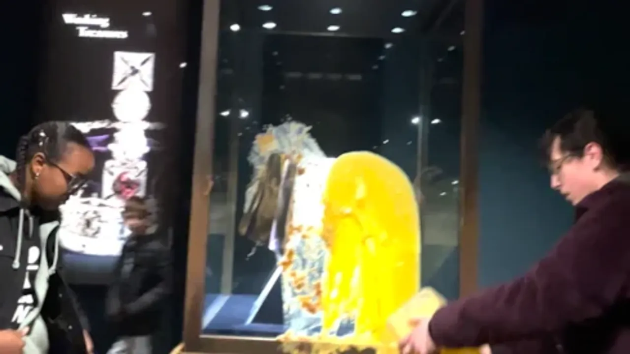 Hayat pahalılığı ve vergi politikalarından şikayetçi bir grup İngiliz aktivist, Londra Kule'sinde sergilenen Devlet Tacı'nın vitrinine muhallebi fırlattı.