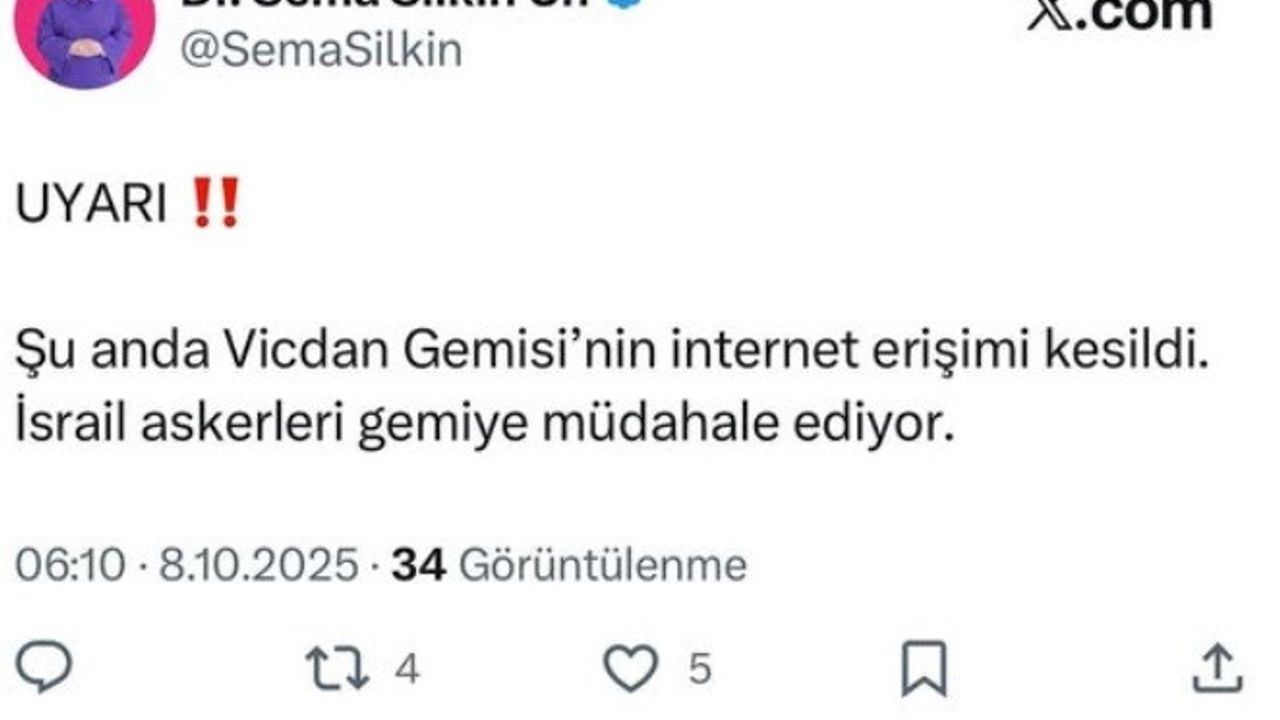 İsrail’in Gazze’ye uyguladığı ablukayı kırmak ve insani yardımları ulaştırmak için yola çıkan Küresel Sumud Filosu’na Tunus’tan katılamayan Denizli Milletvekili Sema Silkin Ün, daha sonra İtalya’daki Otranto Limanı’ndan Akdeniz’e açılan "Vicdan" gemisi ile bu sabah saatlerinde Gazze açıklarındaki uluslararası karasularına ulaştı. Dün akşam bir video paylaşan Ün, bu sabah saat 06.00 sıralarında ise internet erişiminin kesilmesinin ardından İsrail askerlerinin gemiye müdahale ettiğini duyurdu.