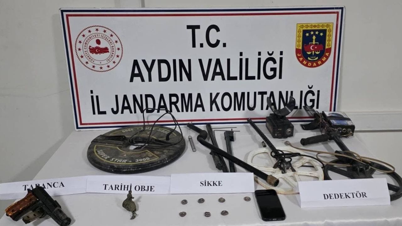 Aydın İl Jandarma Komutanlığı Karacasu İlçe Jandarma Komutanlığı ekiplerince 12 Mart 2026 tarihinde Yaykın Mahallesi'nde İ. D. (63) isimli şahsın ikametinde arama kararına istinaden arama yapıldı. Yapılan aramada 7 adet Athena gümüş Yunan sikkesi olduğu değerlendirilen tarihi obje, 1 adet minyatür heykel, 3 adet dedektör, 1 adet tabanca ve şarjörü, 1 adet cep telefonu ele geçirildi.