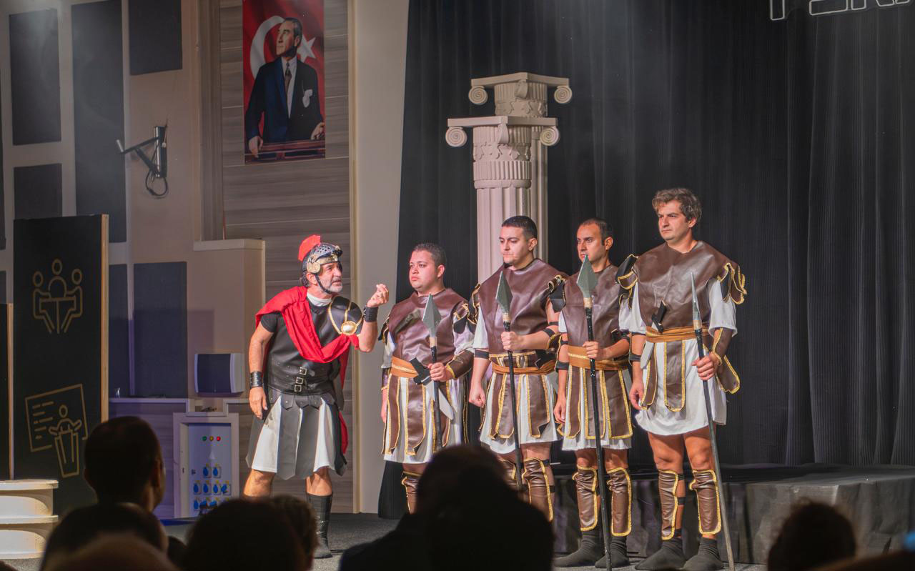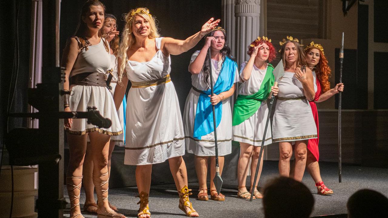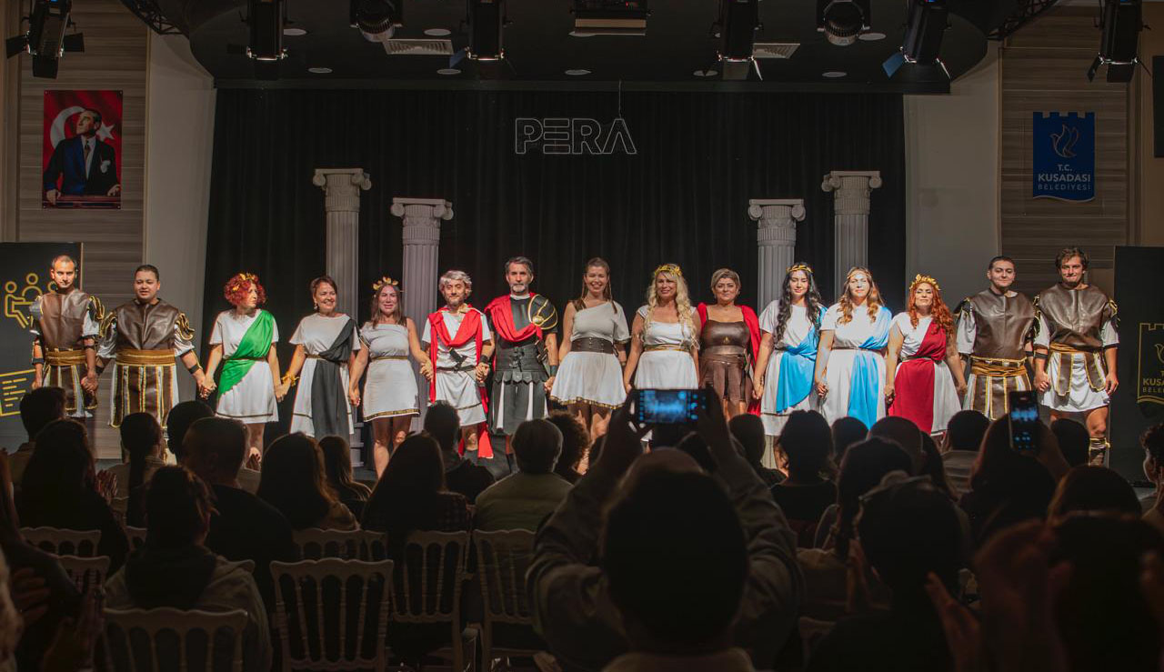 Aydın Kuşadası Belediye Tiyatrosu Genel Sanat Yönetmeni Mehmet Turan’ın yönetiminde sahnelenen oyun, hem güçlü temasıyla hem de amatör ruhun içten performansıyla izleyicilerden tam not aldı. Sahneye çıkan 15 kursiyer, kadın dayanışması ve barış mesajlarını hicivle harmanlayan oyunla büyük beğeni topladı. Yıl boyunca özveri ile çalışan kursiyerlerin başarısı, izleyenlerin alkışlarıyla taçlandı.