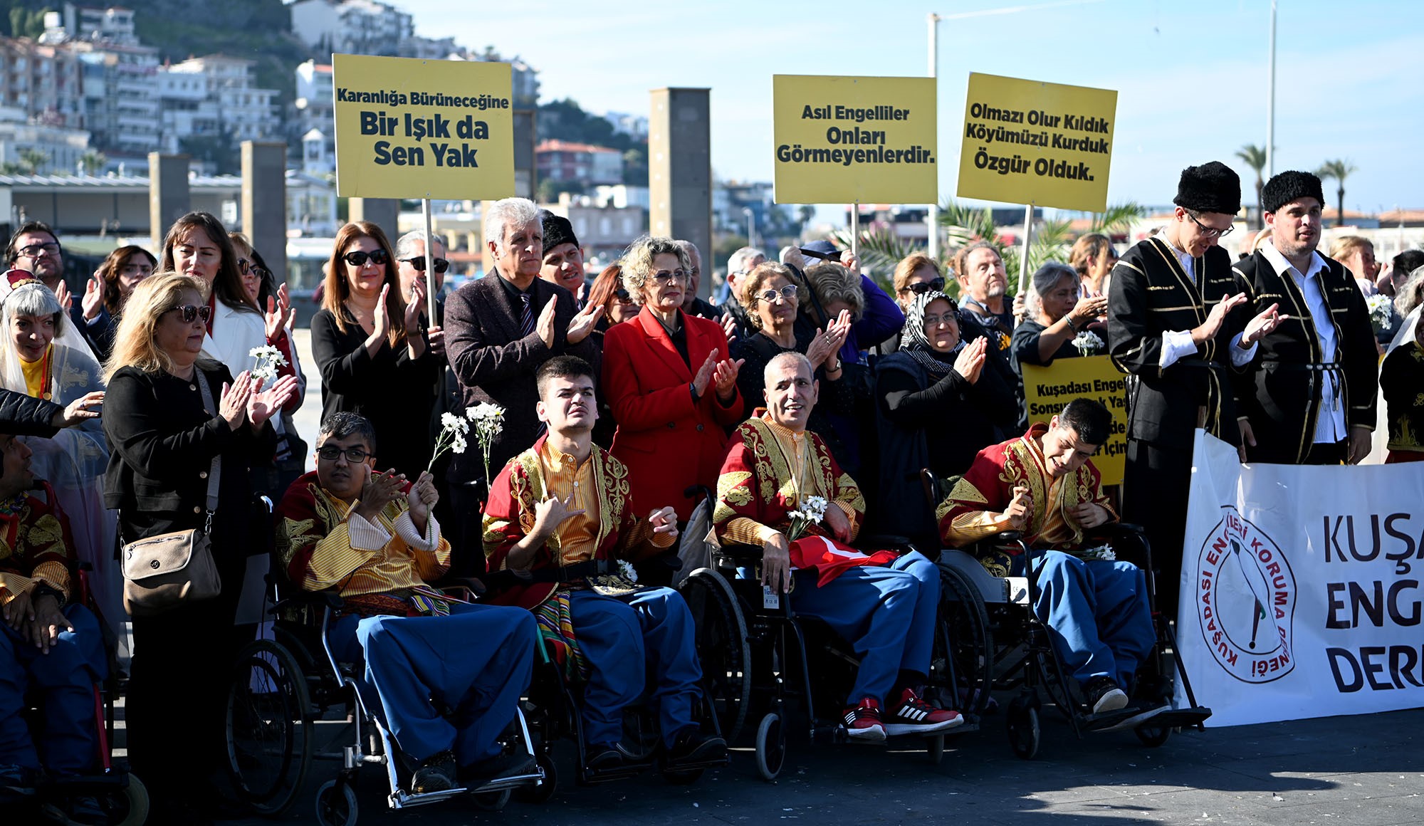 Kuşadası'nda 3 Aralık Dünya Engelliler Günü kutlama etkinlikleri kapsamında İsmail Cem Dostluk ve Barış Meydanı'ndan başlayan ve Atatürk Meydanı'nda son bulan kortej gerçekleştirildi. Korteje Kuşadası Belediyesi Meclis Üyeleri, Kuşadası Kent Konseyi Engelli Meclisi, Kuşadası Engelsiz Engelliler Yaşatma Derneği, Kuşadası Engellileri Koruma Derneği, Kuşadası Erdoğan Öven Engelliler Köyü üyeleri ve sivil toplum kuruluşları katıldı. Kortejin ardından engelli bireylerin yaşadıkları sorunlara dikkat çekmek ve farkındalık oluşturmak amacıyla Atatürk Anıtı'na çelenk koyuldu. Saygı duruşunda bulunulup, İstiklal Marşı'nın okunmasından sonra Erdoğan Öven Engelliler Köyü'nde eğitim gören öğrenciler konser verdi. Öğrencilerin çeşitli halk oyunları gösterileri de sergilediği kutlama etkinliğini, Kuşadası Kaymakamı İbrahim Keklik ve Kuşadası Belediye Başkan Yardımcısı Ayşegül Dağlı da izledi. Etkinlikte 'Engel değil destek olun', 'En büyük engel sevgisizliktir', 'Engelli olmak kusur değildir', 'Sevgi ile engelsiz yarınlara hep birlikte' yazılı pankartlarla da duyarlılık mesajları verildi.