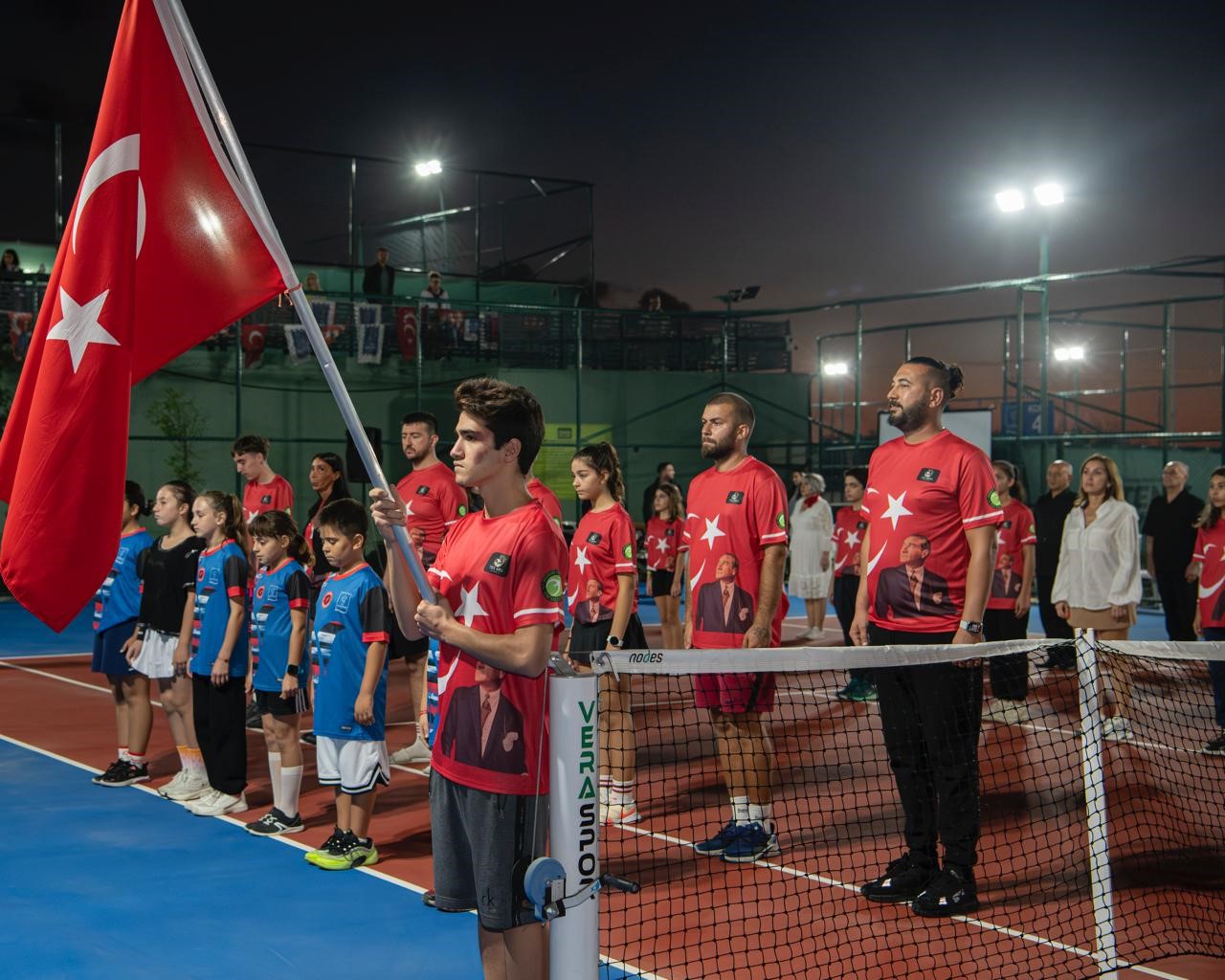 Gecede Kuşadası Kent Konseyi Cumhuriyet Sevdalıları Grubu, Atatürk’ün izinde hazırladıkları vals ve zeybek gösterileriyle sahne aldı. Cumhuriyet’in ruhunu en zarif biçimde yansıtan bu performans, izleyenlere unutulmaz anlar yaşattı. Ardından kortlara meşaleler eşliğinde çıkan tenisçiler, Cumhuriyet meşalesini simgeleyen görkemli bir kortej oluşturdu.