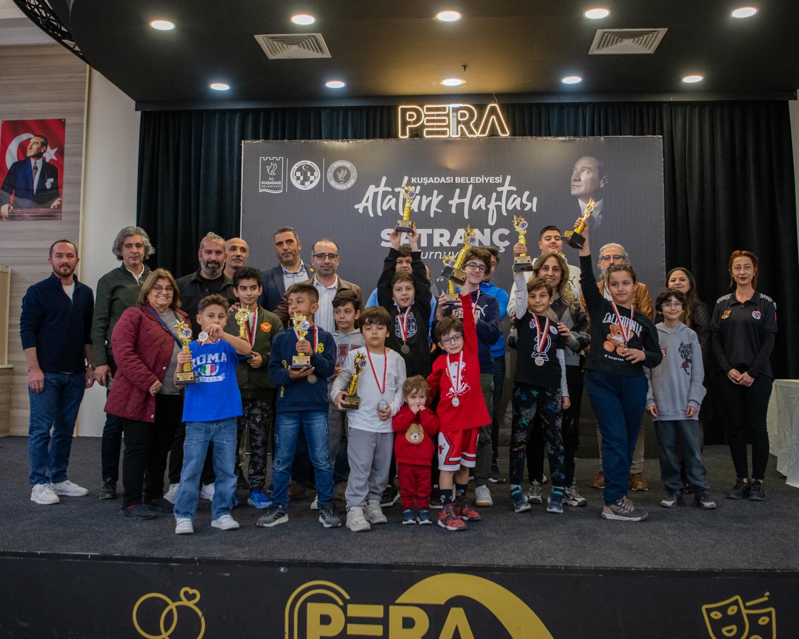 Pera Kültür, Düğün ve Organizasyon Merkezi’nde gerçekleştirilen ‘Atatürk Haftası Satranç Turnuvası’na’ Türkiye’nin farklı ilçelerinden 120 kişi katıldı. 8, 10, 12, 14 yaş altı ve açık kategorilerinde düzenlenen turnuvada maçlar çekişmeye sahne oldu. Maçlarda, rakiplerini ‘mat’ etmek için mücadele eden sporcular heyecanlı anlar yaşadı. Piyonların tahtada çarpıştığı turnuvada vezir, kale, fil ve at yaptıkları hamlelerle baş döndürdü. Turnuva sonunda dereceye giren sporculara kupa ve madalyaları Kuşadası Belediye Spor Başkanı Mehmet Sarıdedeoğlu tarafından verildi.