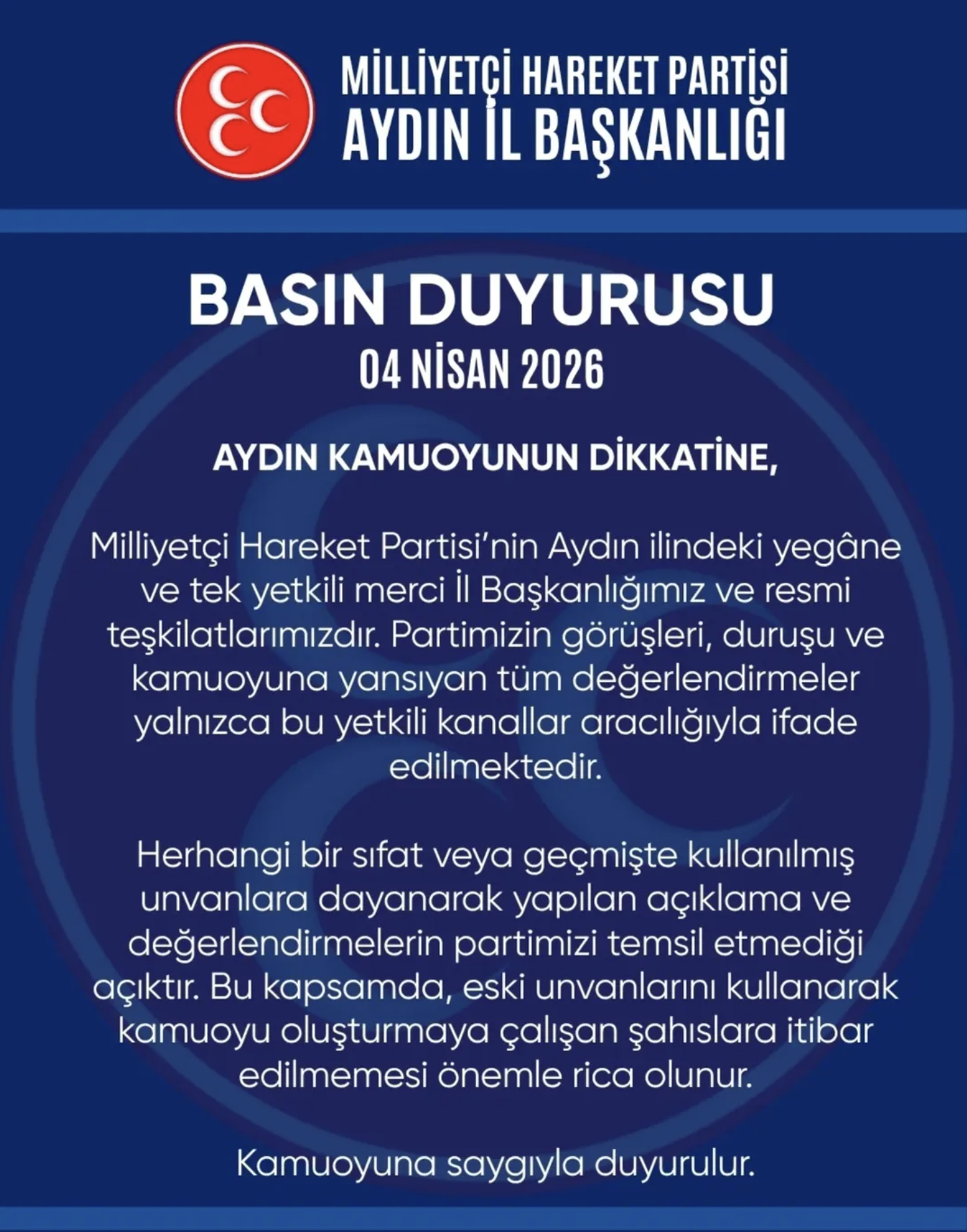 Parti açıklamasında, “Aydın kamuoyunun dikkatine, Milliyetçi Hareket Partisi’nin Aydın ilindeki yegâne ve tek yetkili merci il başkanlığımız ve resmi teşkilatlarımızdır. Partimizin görüşleri, duruşu ve kamuoyuna yansıyan tüm değerlendirmeler yalnızca bu yetkili kanallar aracılığıyla ifade edilmektedir” ifadelerine yer verildi.