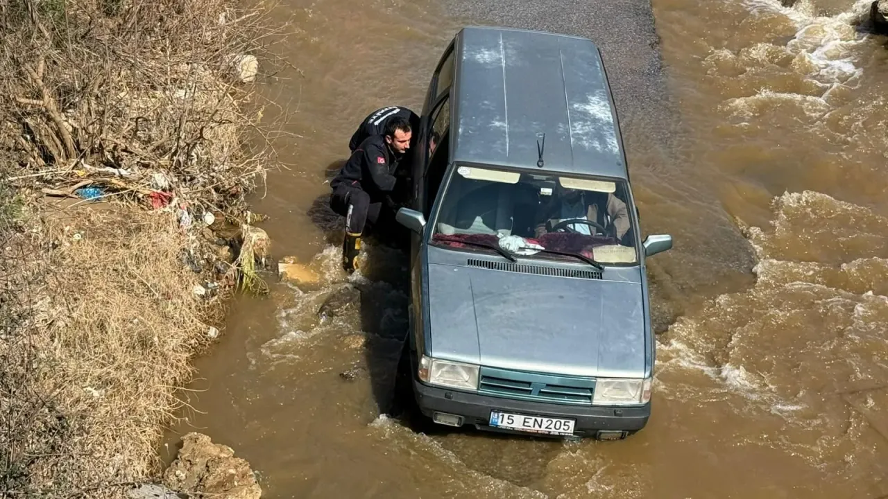 İhbar üzerine bölgeye itfaiye ve jandarma ekipleri sevk edildi. Kısa sürede olay yerine ulaşan ekipler, güvenlik önlemlerini alarak aracı bulunduğu yerden kurtardı. Olayda herhangi bir yaralanma yaşanmadı.