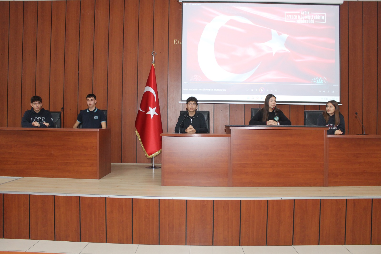 Programın açılış konuşmasını yapan Efeler İlçe Milli Eğitim Müdürü Hakan Özcan, öğrencilerin demokratik süreçlere katılımının önemine vurgu yaptı. Özcan konuşmasında, Atatürk’ün “Egemenlik kayıtsız şartsız milletindir” sözünü hatırlatarak, demokrasinin Türkiye’nin vazgeçilmez bir değeri olduğunu ifade etti. Türkiye Yüzyılı Maarif Modeli’nin temel hedeflerinden biri olan Demokrasi Becerilerinin öğrencilere kazandırılması gerektiğini belirten Özcan, öğrenci meclisinin gençlerin kendilerini ifade edebileceği önemli bir platform sunduğunu söyledi.