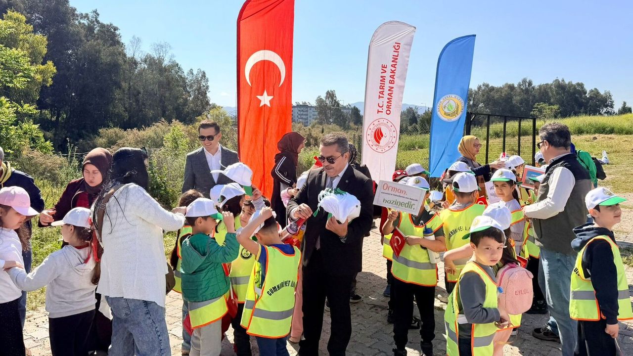 Aydın'da "Yeşil Vatan: Benim Okulum Geleceğe Çare" protokolü kapsamında düzenlenen etkinlikte ilkokul öğrencileri hem doğayı tanıdı hem de fidan dikti.