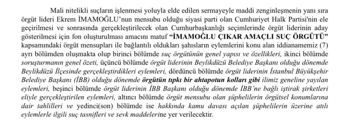 7 bölümden oluşan iddianamede giriş kısmında "CHP’nin ele geçirilmesi ve sonrasında gerçekleştirilecek olan Cumhurbaşkanlığı seçimlerinde örgüt liderinin aday gösterilmesi için fon oluşturulması amacına maruf "İmamoğlu Çıkar Amaçlı Suç Örgütü" diye belirtildi.