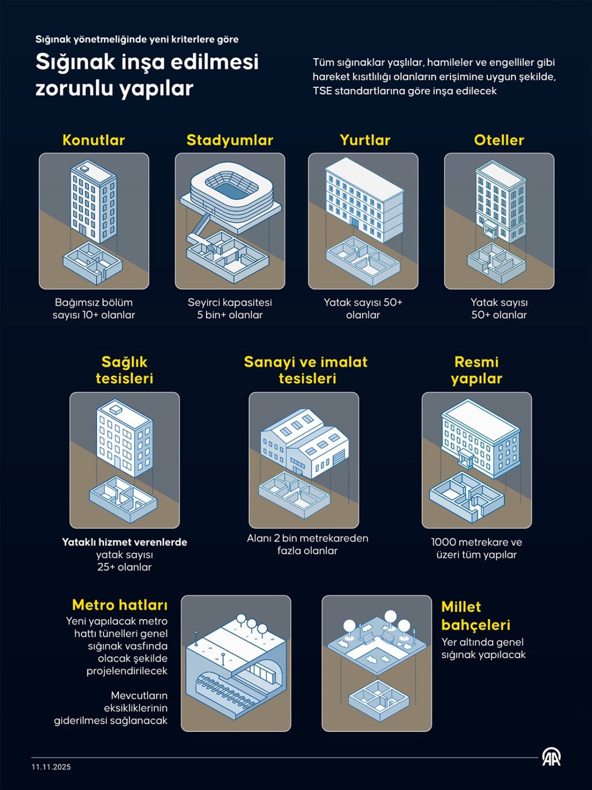 Yeni düzenleme ile belirlenen kriterlerin üzerindeki yeni yapılacak konutlarda, yurt, otel ve bakımevi gibi yataklı hizmet veren sağlık tesisleri ile sanayi ve imalat tesislerine, sığınak yapma zorunluluğu getirildi.