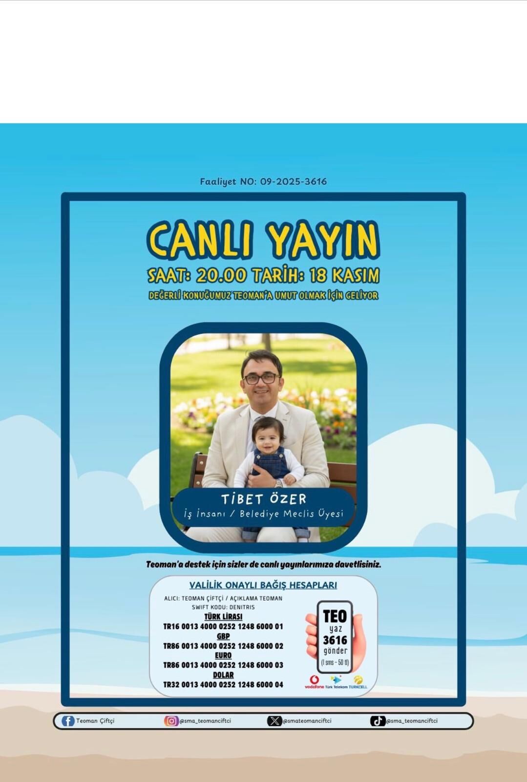 Kuşadalı iş insanı Tibet Özer, SMA hastası Teoman bebeğin tedavisine destek olmak amacıyla 27 Kasım Perşembe günü saat 20.00’da sosyal medya hesabından canlı yayın düzenleyecek. Özer, bugüne kadar birçok SMA’lı çocuğa yapılan dayanışmaya dikkat çekerek, “Geçmişte el uzattığımız yavrularımız bugün arkadaşlarıyla koşup oynuyor, anne babalarının kalbi mutlulukla çarpıyor. Şimdi Teoman bebeğimiz için bir kez daha bir araya gelme zamanı” dedi.