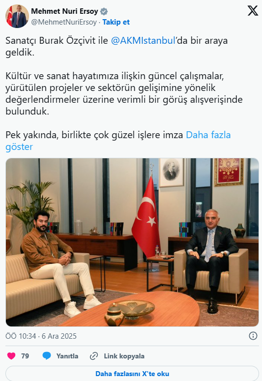 Kültür ve Turizm Bakanı Mehmet Nuri Ersoy, oyuncu Burak Özçivit ile İstanbul Atatürk Kültür Merkezi'nde bir araya geldi. Bakan Ersoy, görüşmeye dair açıklamasını sosyal medya hesabından paylaştı.