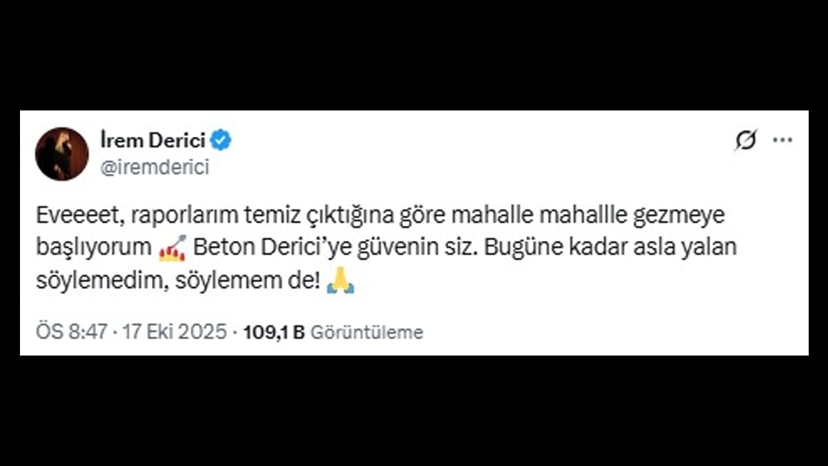 Testleri negatif çıkan isimlerden İrem Derici, sonuçların temiz çıkmasının ardından, “Raporlarım temiz çıktığına göre mahalle mahalle gezmeye başlıyorum. Beton Derici’ye güvenin siz. Bugüne kadar asla yalan söylemedim, söylemem de” ifadeleriyle esprili bir paylaşım yaptı. Diğer negatif çıkan isim Feyza Altun ise, “Sınanmışlığın kibri. Allah beni yargılayan herkesi onunla sınasın” mesajını verdi.