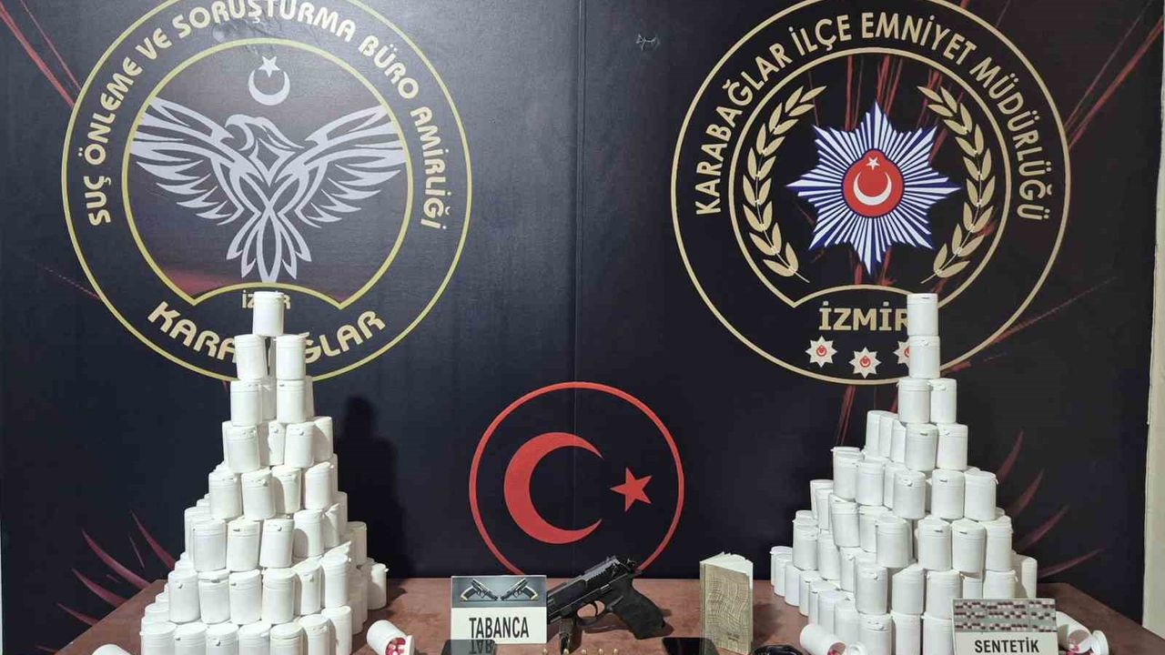 Karabağlar İlçe Emniyet Müdürlüğü Suç Önleme ve Soruşturma Büro Amirliği ekipleri, ilçede uyuşturucu madde kullanımı ve ticaretine yönelik yürüttükleri çalışmalarda A.K. (44) ve M.A.'nın (24) birlikte uyuşturucu sattığını ve sattıkları maddeleri Konak ilçesindeki bir ikamette sakladığını tespit etti. Adreslere eş zamanlı operasyon düzenleyen polis ekipleri, şüphelilerin adreslerinde yaptıkları aramada, 14 bin 642 adet uyuşturucu hap, 10.52 gram esrar ve 1 adet ruhsatsız tabanca ele geçirdi.