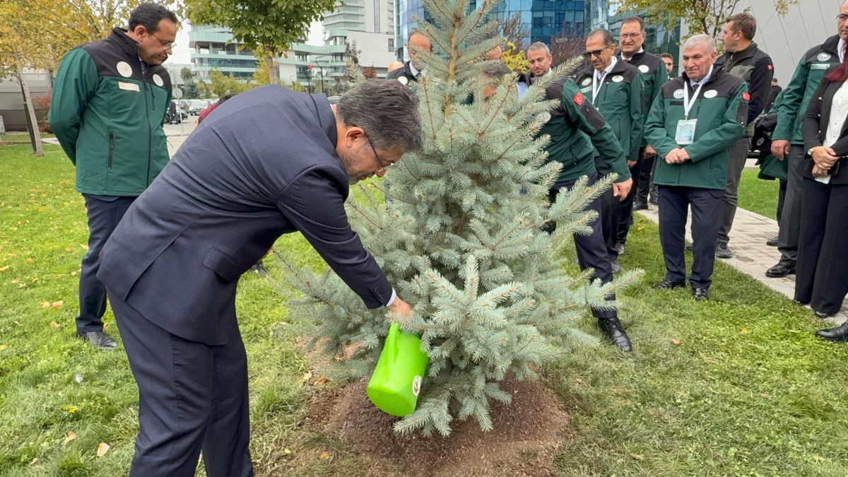 Serginin açılışı öncesi Bakan Yumaklı, genel müdürlük bahçesinde dikilen fidanlara su verdi.