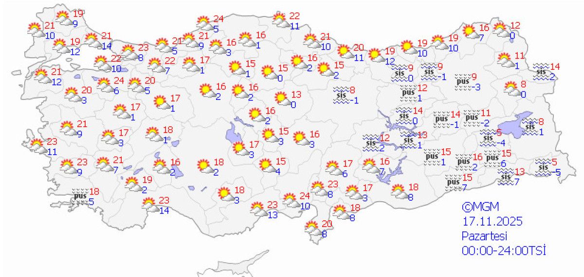 Meteorolojinin son haritasına göre 24 ile ise sarı uyarı verildi.