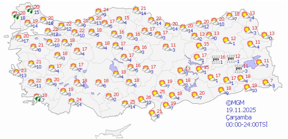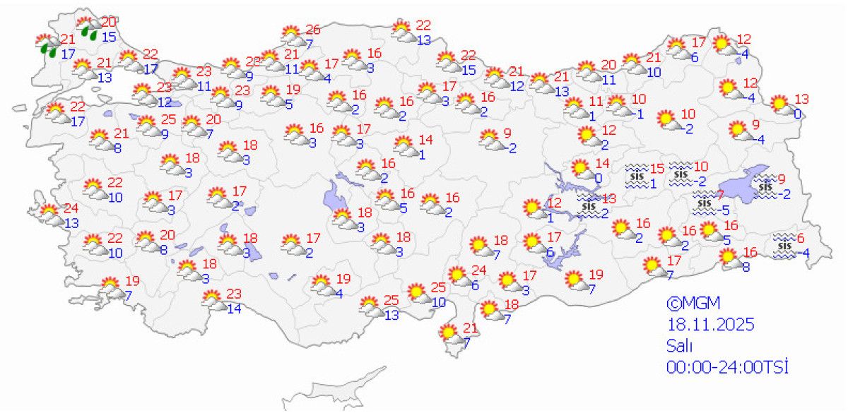 Meteoroloji Genel Müdürlüğü tarafından yapılan tahminlere göre; yurt genelinin parçalı ve çok bulutlu, Marmara’nın doğusu, Orta ve Doğu Akdeniz, İç Anadolu’nun güney ve doğusu, Karadeniz, Doğu Anadolu’nun kuzey ve batısı, Güneydoğu Anadolu’nun batısı ile Antalya, Bingöl ve Diyarbakır çevrelerinin yağmur ve sağanak yağışlı, Doğu Karadeniz’in iç kesimlerinin yüksekleri ile Doğu Anadolu’nun kuzey kesimlerinin yükseklerinin karla karışık yağmur ve yer yer kar yağışlı geçeceği tahmin ediliyor.