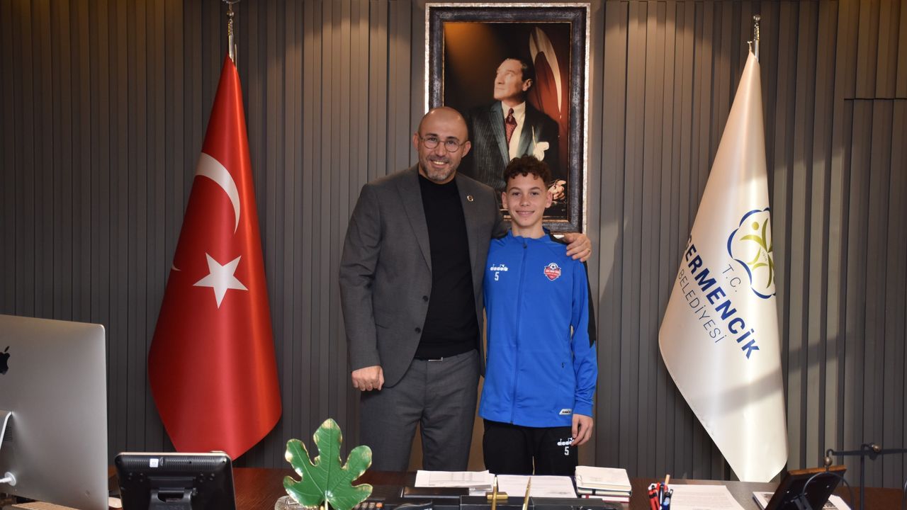 Germencik Belediye Başkanı Burak Zencirci, Türkiye genelinde yapılan seçmelerde 2000 sporcu arasından A Milli U-14 Futbol Takımı’na seçilen Germencikli genç yetenek Kuzey Topçu’yu makamında ağırlayarak tebrik etti. Başkan Zencirci, ilçenin genç sporculara verdiği değeri vurgulayan bu önemli buluşmada, Kuzey’in başarısının Germencik için gurur verici olduğunu ifade etti.